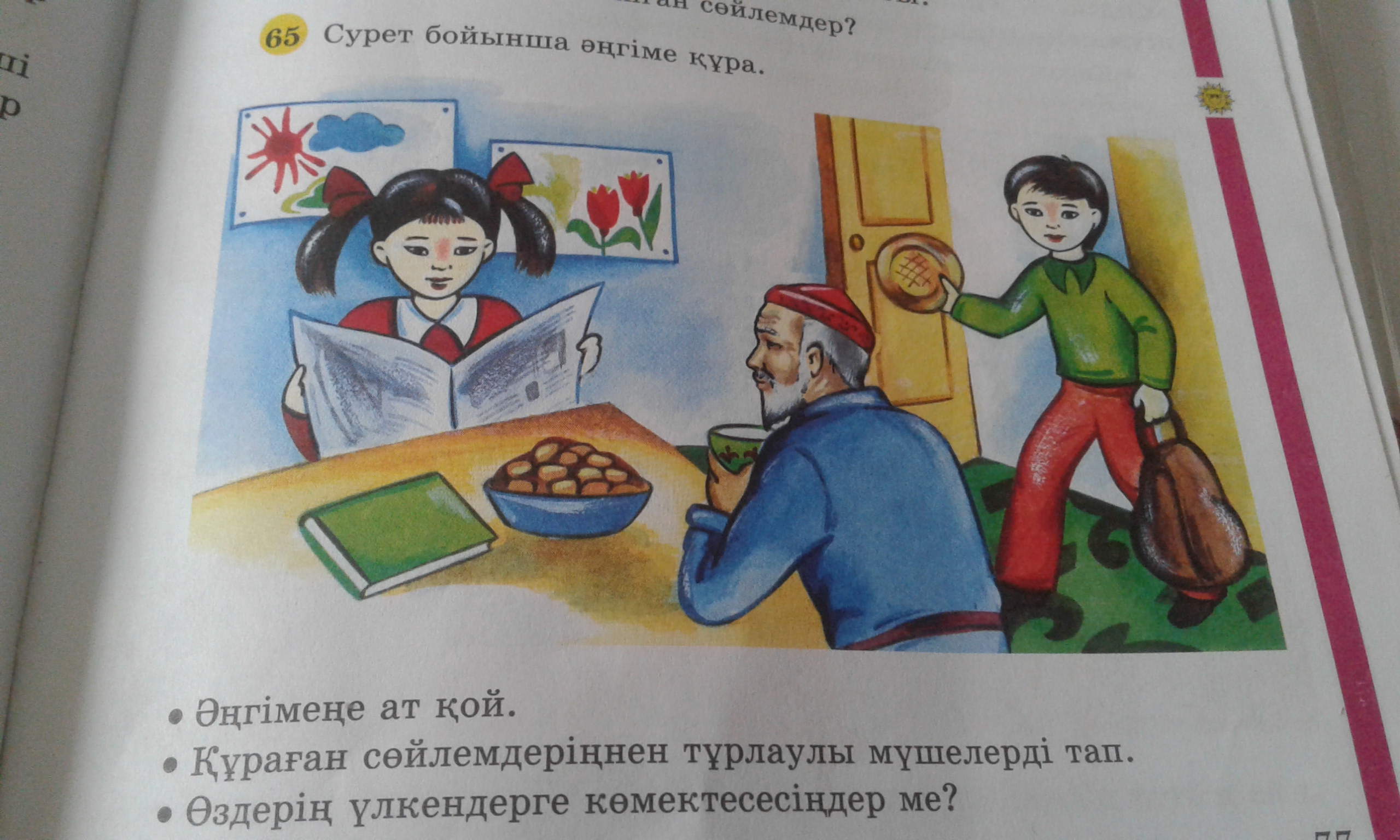 Біздің үйге ауылдан атамыз келіп мəре сəре болдық. Мен өзімінің сабағымнан бос уақытында Атама газет журналдағы даңалықтарды оқып бермін. Ал Олжас болса дүкенге барып ыстық нан жəне кəмпиттер алып келді. Атам біздің көрсеткен қамқорлығымызға дəн риза.