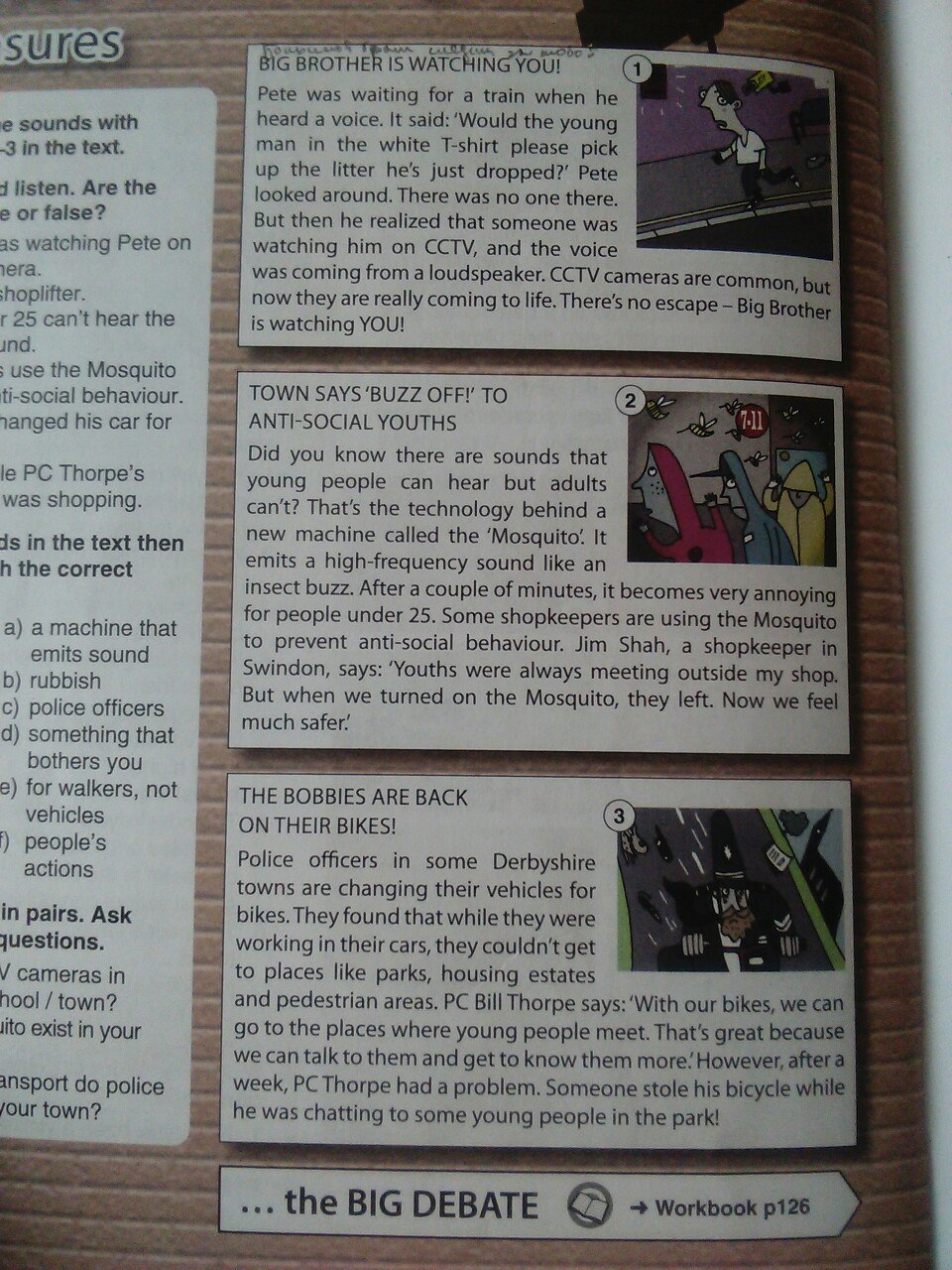 3ПОЛИСМЕН ВЕРНУЛИСЬ НА СВОИ ВЕЛОСИПЕДЫ! Сотрудники полиции в некоторых Дербишир городов меняют свои автомобили на велосипеды, они обнаружили, что, когда они работали на своих машинах, они не могли добраться до места, как парки, жилые массивы и пешеходных зон. Билла ПК Торп говорит: с нашими велосипедами, мы можем пойти в те места, где молодые люди встречаются, что здорово, потому что мы можем поговорить с ними и узнать больше, однако их знаю, через неделю, компьютер и Торп были проблемы. Кто-то украл его велосипед, пока он болтал с какой-то молодой человек в парке! большая дискуссия @ книги p126