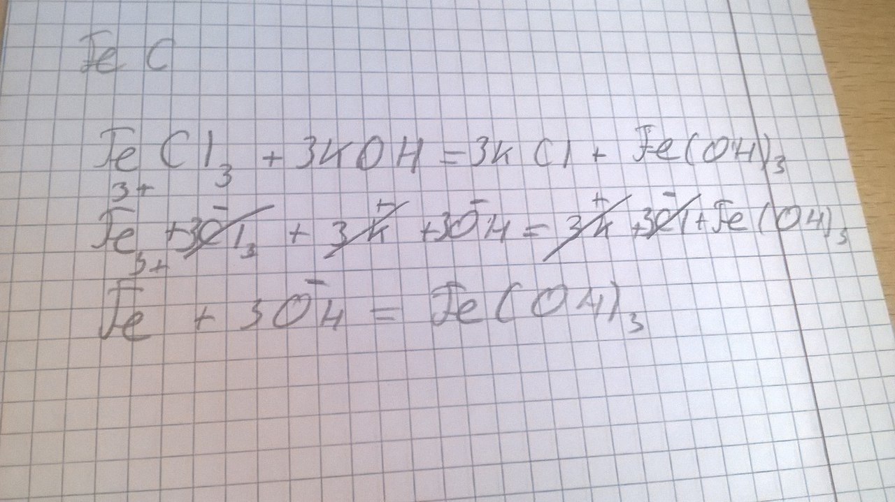 Напишите полное ионное и сокращённое ионное уравнение для реакции между хлоридом железа(3) и гидроксидом калия