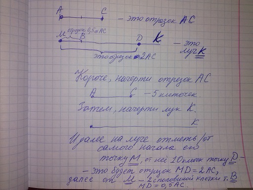 Начертите отрезок AC и луч K. На луче от его начала отложите с помощью линейки отрезки длины которых равны 2AC и 0,5 AC.