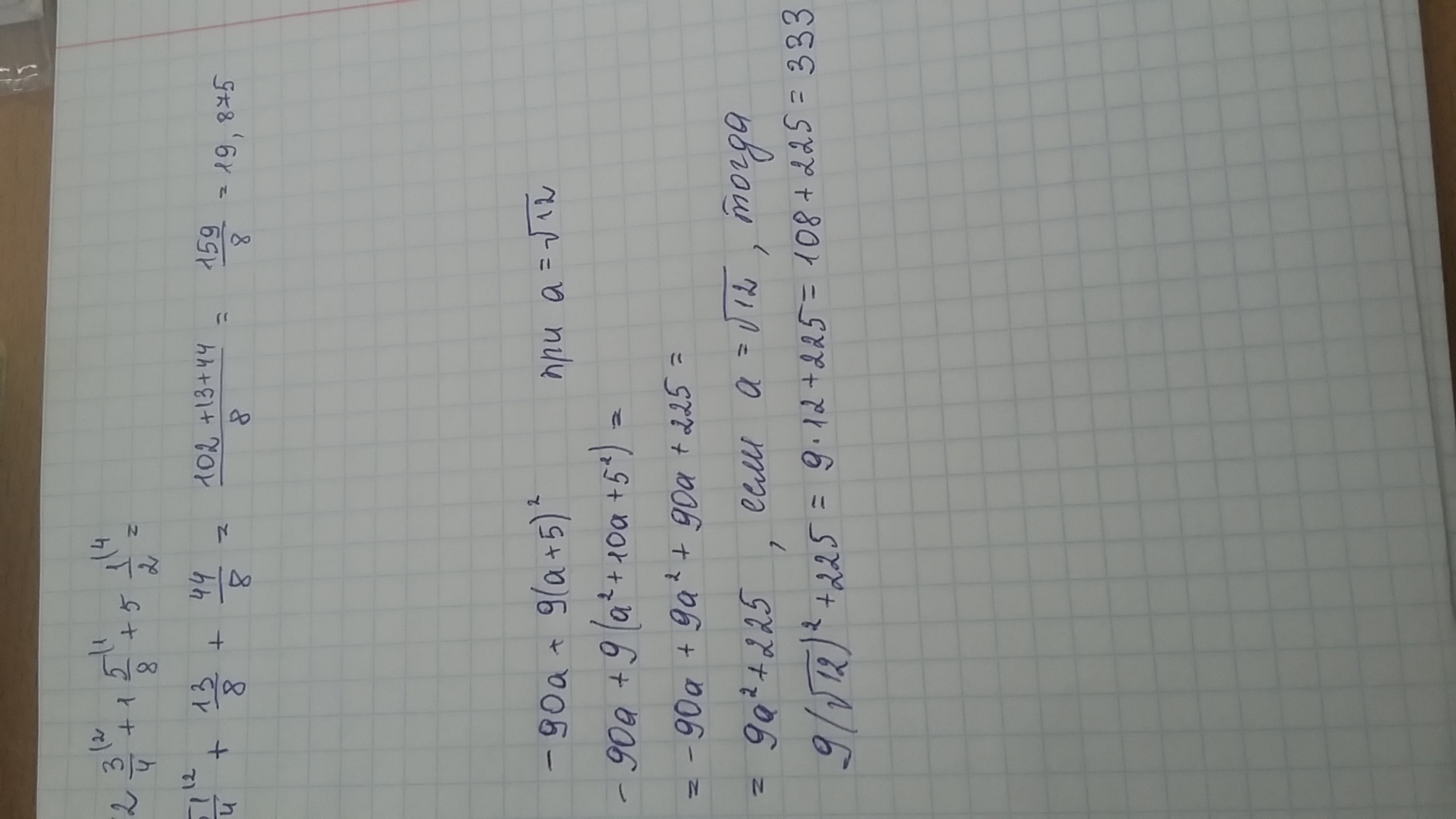 -90а+9(а^2+10а+5^2)=-90а+9а^2+90а+225=9а^2+225, если а=√12, тогда