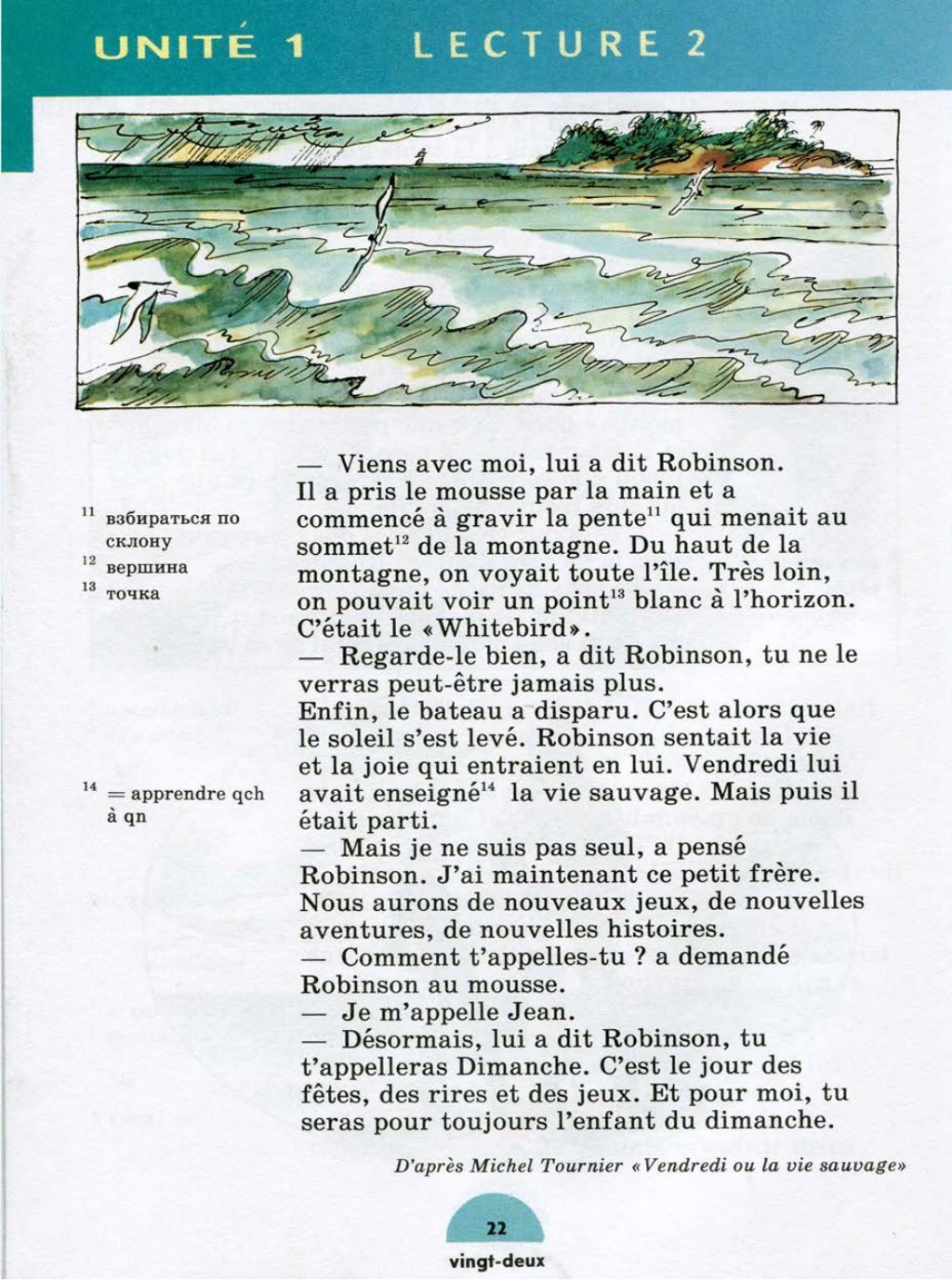 Заря была еще бледной. Робинзон ждал первых лучей солнца, чтобы подняться. Этой ночью он плохо спал. Это было мясо и соусы, которые он кушал на корабле и которые ему дали тяжелый сон. Робинзон решил пойти искать Пятницу. Но его гамак был пуст. Пятница испарился. Он его покинул. Но, почему, почему? В этот момент он услышал шум. Покатился камень. И тут он увидел ребенка. Ему могло быть 12 лет. Он был худым, как птица, с веснушками на лице.