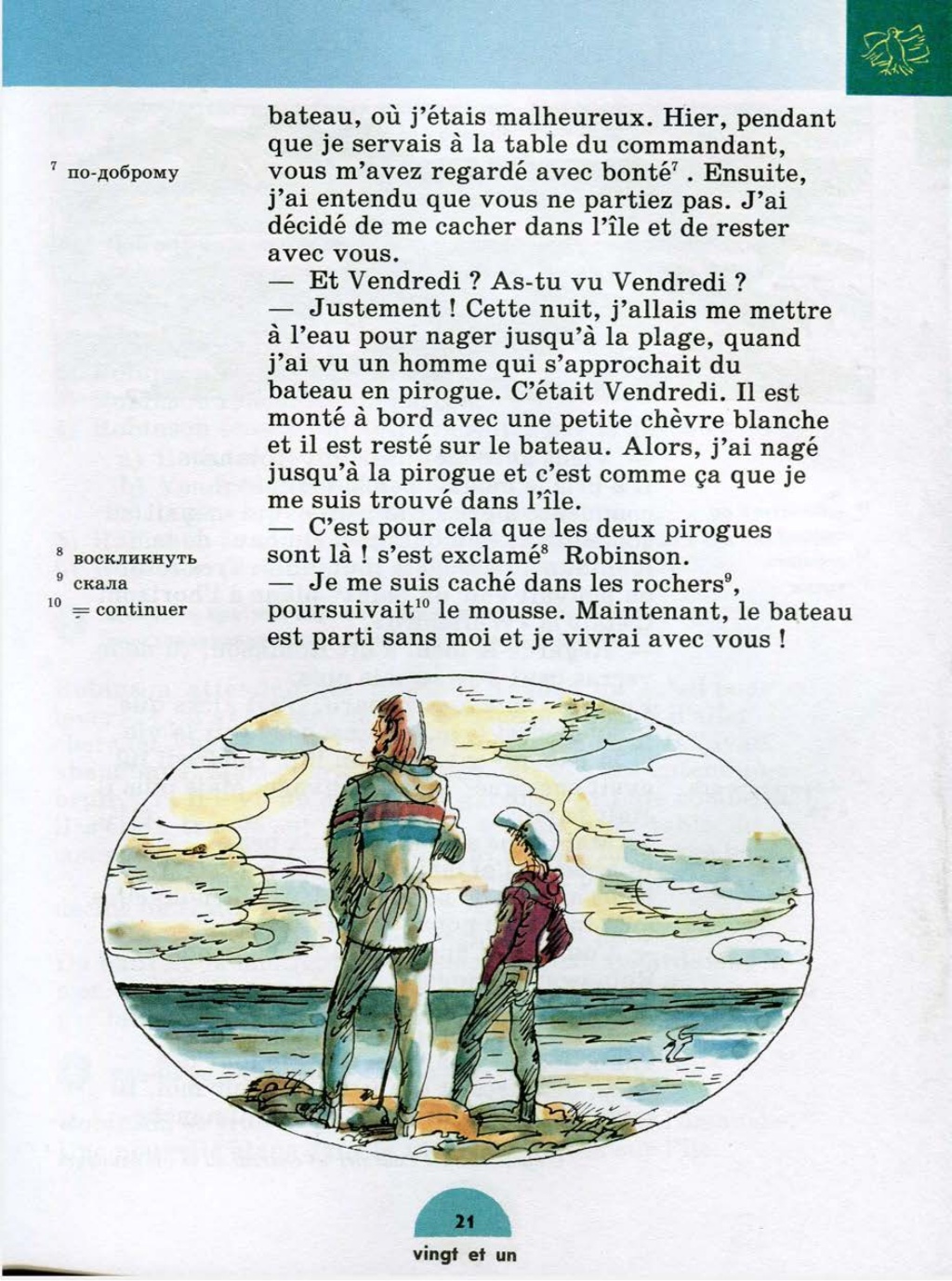 Наконец, корабль исчез. Таким образом, солнце взошло. Робинзон чувствовал жизнь и радость, которые входили в него. Пятница его обучал жизни в дикой природе. Но потом он уехал.