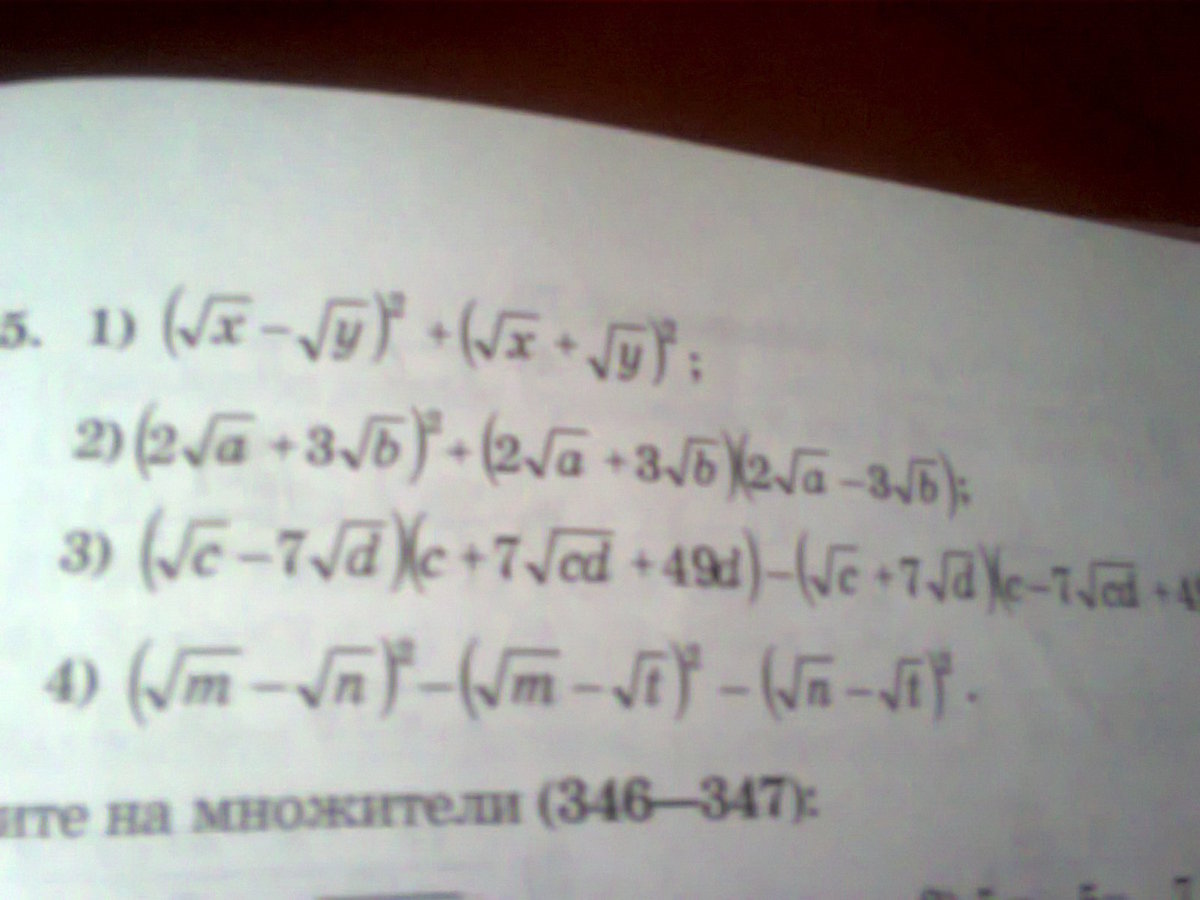 4)(Vm-Vn)^2-(Vm-Vt) ^2- (Vn-Vt ) ^2 = m-2Vmn+m-(m-2Vmt+t)-(n-2Vnt+t)= m-2Vmn+m-m+2Vmt-t-n+2Vnt-t=m-2Vmn+2Vmt+2Vnt-2t