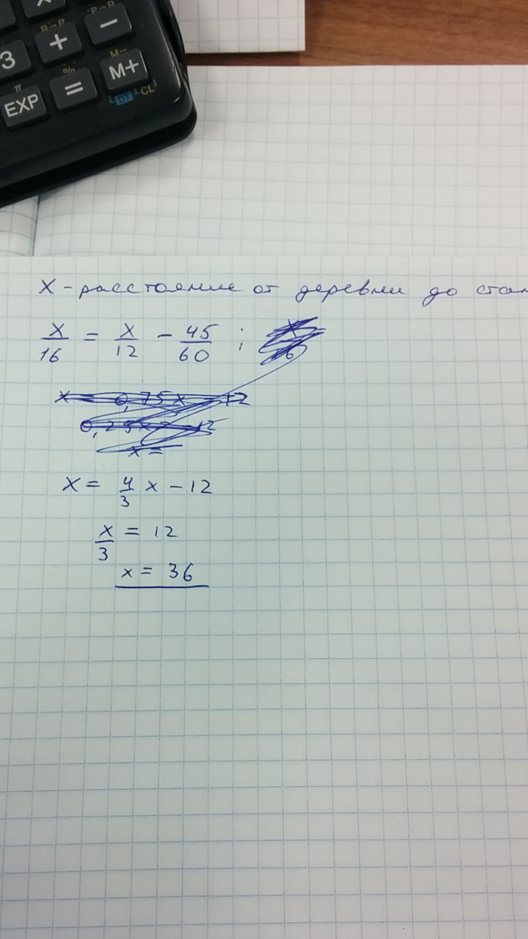 От деревни до станции велосипедист ехал со скоростью 16 км/ч, а обратно он возвращался со скоростью 12 км/ч. Найдите расстояние от деревни до станции, если известно, что на обратный путь велосипедист затратил на 45 больше, чем на путь от деревни до станции. найти расстояние расстояние между деревней и станцией