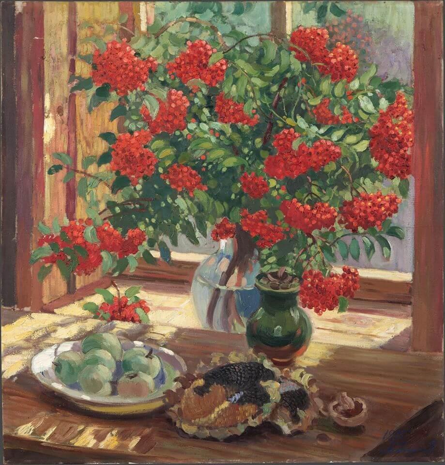 Но центром картины А. Герасимова, безусловно, является рябиновый букет на подоконнике. В прозрачную вазу поставлены свежесрезанные ветви, сгибающиеся под тяжестью огненных кистей. Лист, едва тронутый желтизной, еще крепок и густ. Свет солнца, льющийся из окна, преломляется в вазе, золотит деревянные рамы и стол. Теплые охристые и красно-оранжевые цвета картины, слегка приглушенные зеленью, создают удивительное тепло и уют. Кажется, что произведение светится живым пламенем.