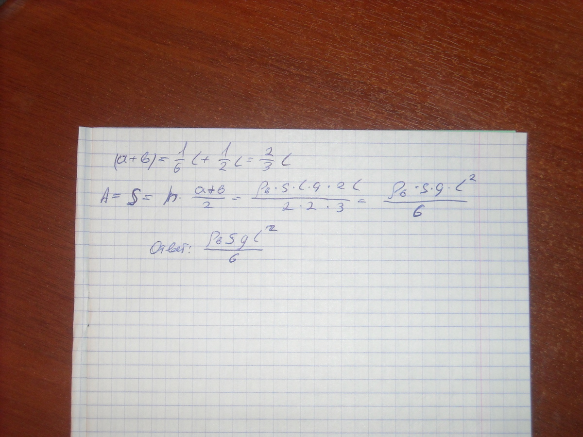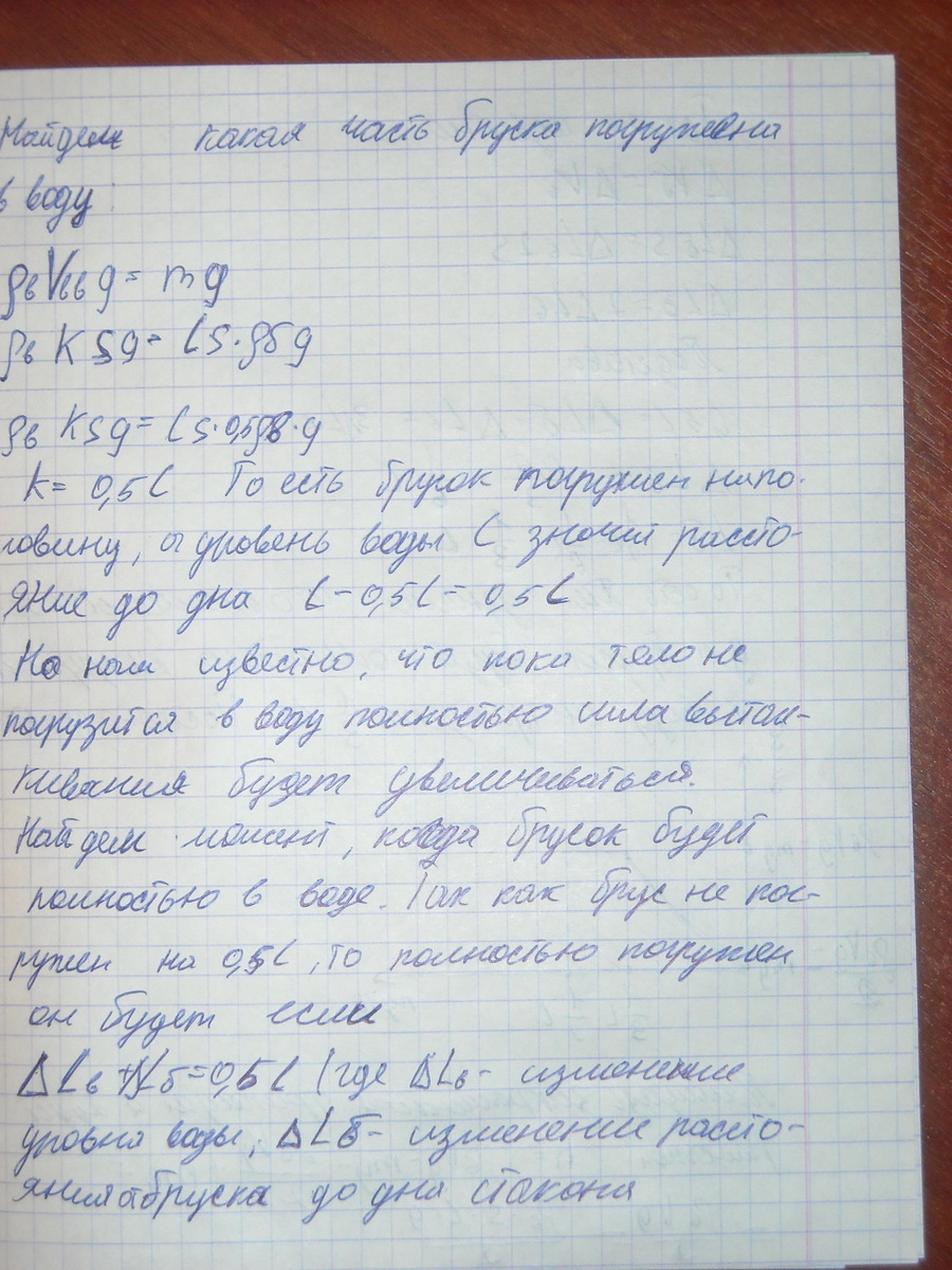 В цилиндрическом сосуде с водой плавает брусок высотой l и сечением S (рис. 10.2). Какую работу необходимо совершить, чтобы с помощью тонкой стальной спицы брусок медленно опустить на дно стакана? Сечение стакана S1 = 2S, начальная высота воды в стакане l, плотность материала бруска р = 0,5 рв, где рв — плотность воды.