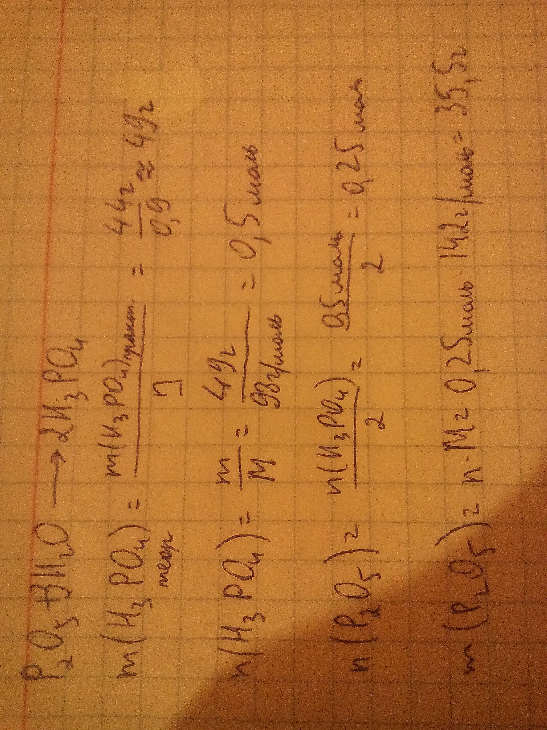 рассчитайте массу высшего оксида фосфора вступившего в реакцию с водой, если получена фосфорная кислота массой 44 г,что составляет 90% от теоретически возможного