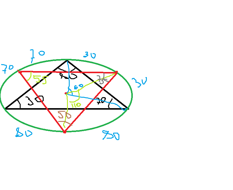 Около треугольника с углами 30,70,80, описана окружность.Определите углы треугольника ,вершины которого совпадают с серединами меньших дуг,стягиваемых сторонами данного треугольника.