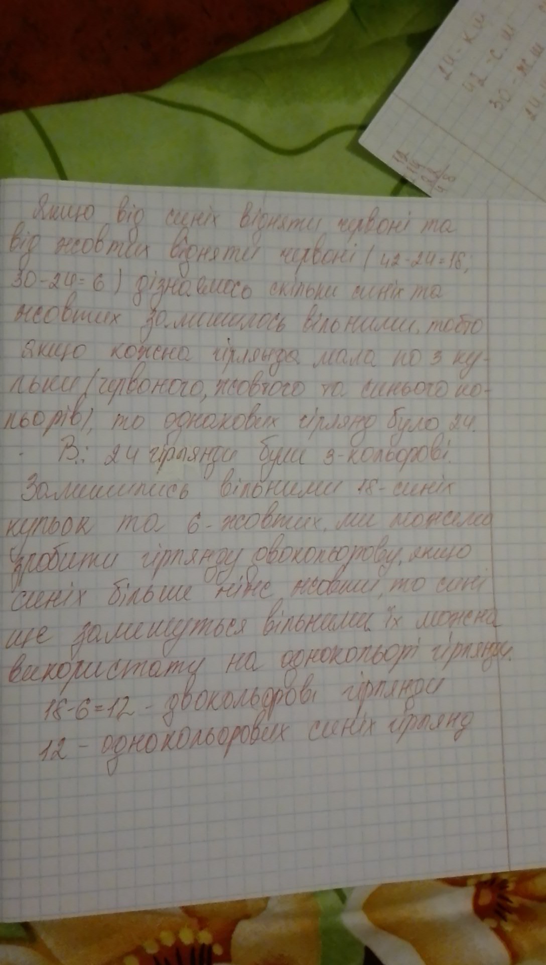Просто нужно найти НОД всех чисел, это будет количество гирлянд, а оставшиеся значения от этих чисел — это количество ламп в каждой гирлянде. То есть, 6 гирлянд, и каждая ммеет 24:6=4, 42:6=7, 30:6=5 ламп определённого цвета соответственно.