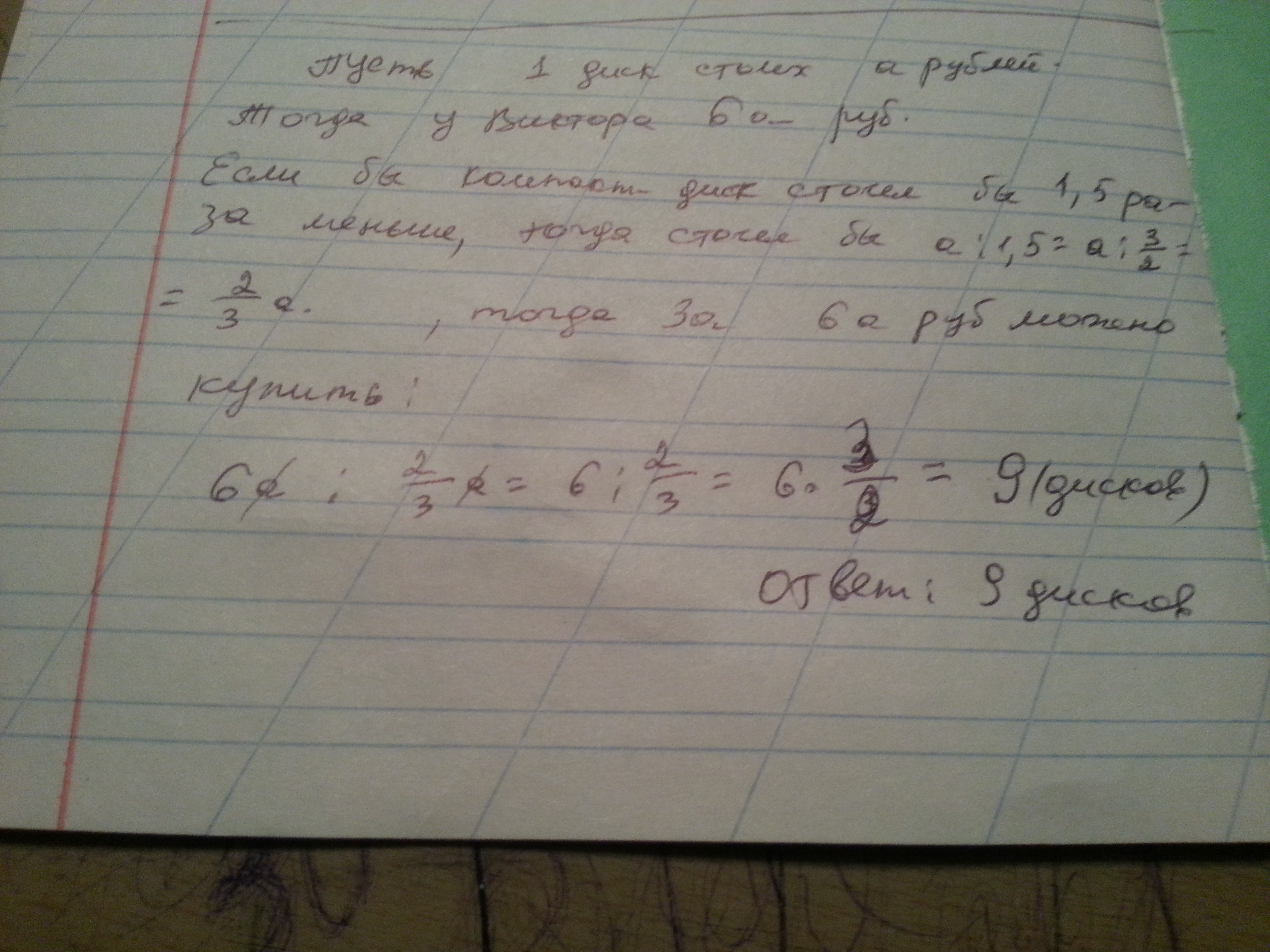 На зарвботанные в каникулы деньги Виктор может купить 6 одинаковых по цене компакт-дисков с любимыми фильмами. Сколько компакт-дисков он мог купить на эти деньги, если бы их цена была в 1,5 раза меньше?