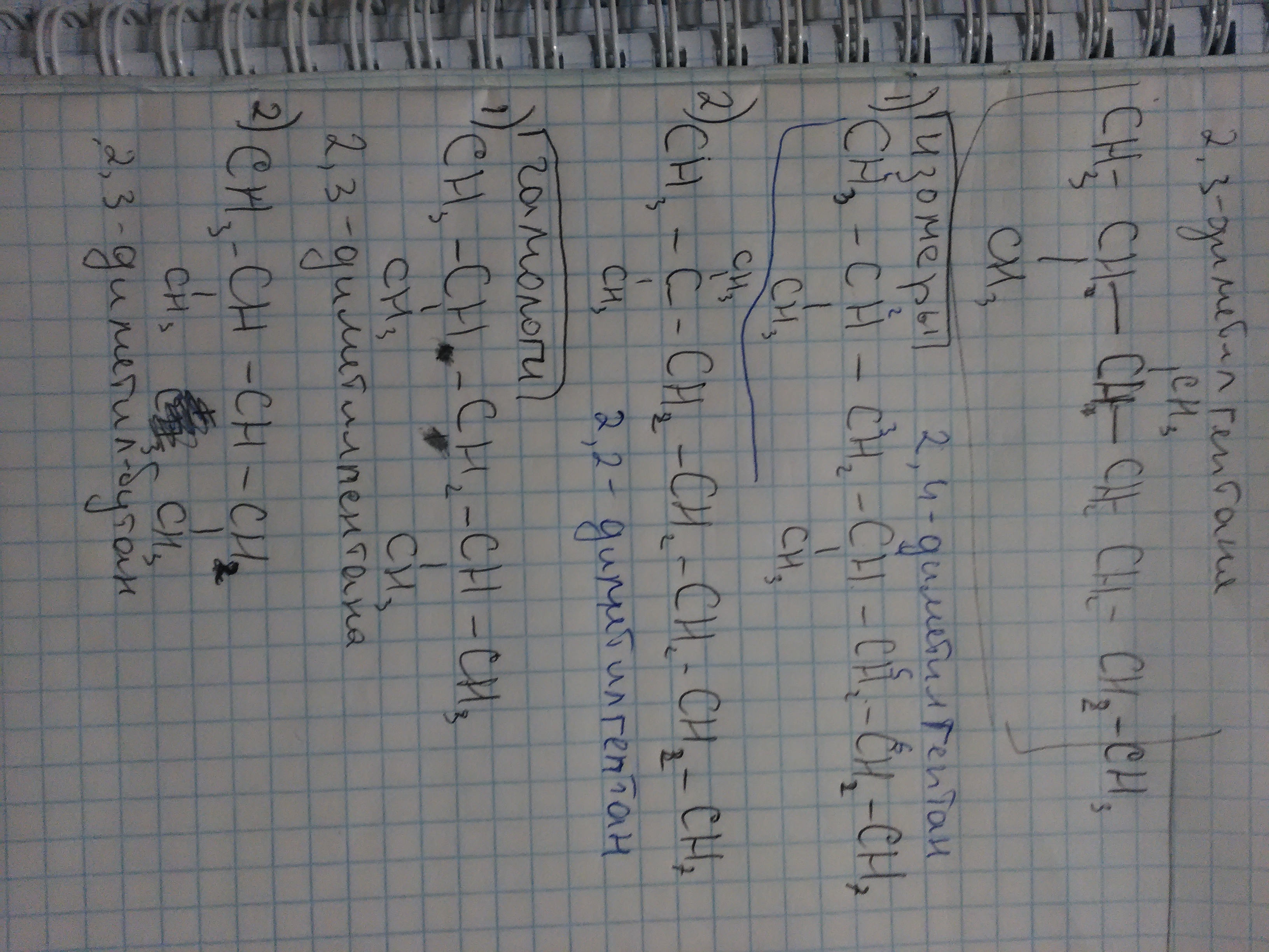 Составьте формулы двух изомеров и двух гомологов для вещества : 2,3 - диметилгептана. Назовите их.
