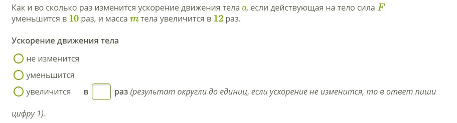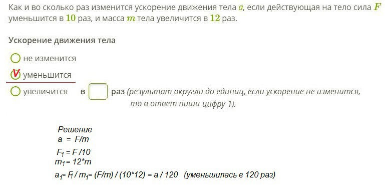 Как и во сколько раз изменится ускорение движения тела а, если действующая на тело сила F уменьшится в 10 раз, и масса m тела увеличится в 12 раз.