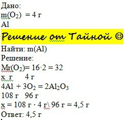 Масса алюминия вступившего в реакцию с 4 г кислорода равна: