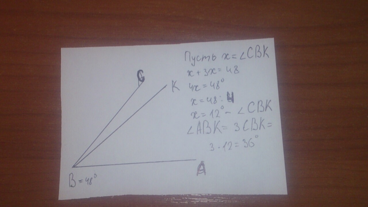 Градусная мера угла ABC равна 48°. Внутри угла проведен луч ВК. Найдите градусные меры углов АВК и СВК, если градусная мера угла АВК втрое болшьше, чем градусная мера угла СВК
