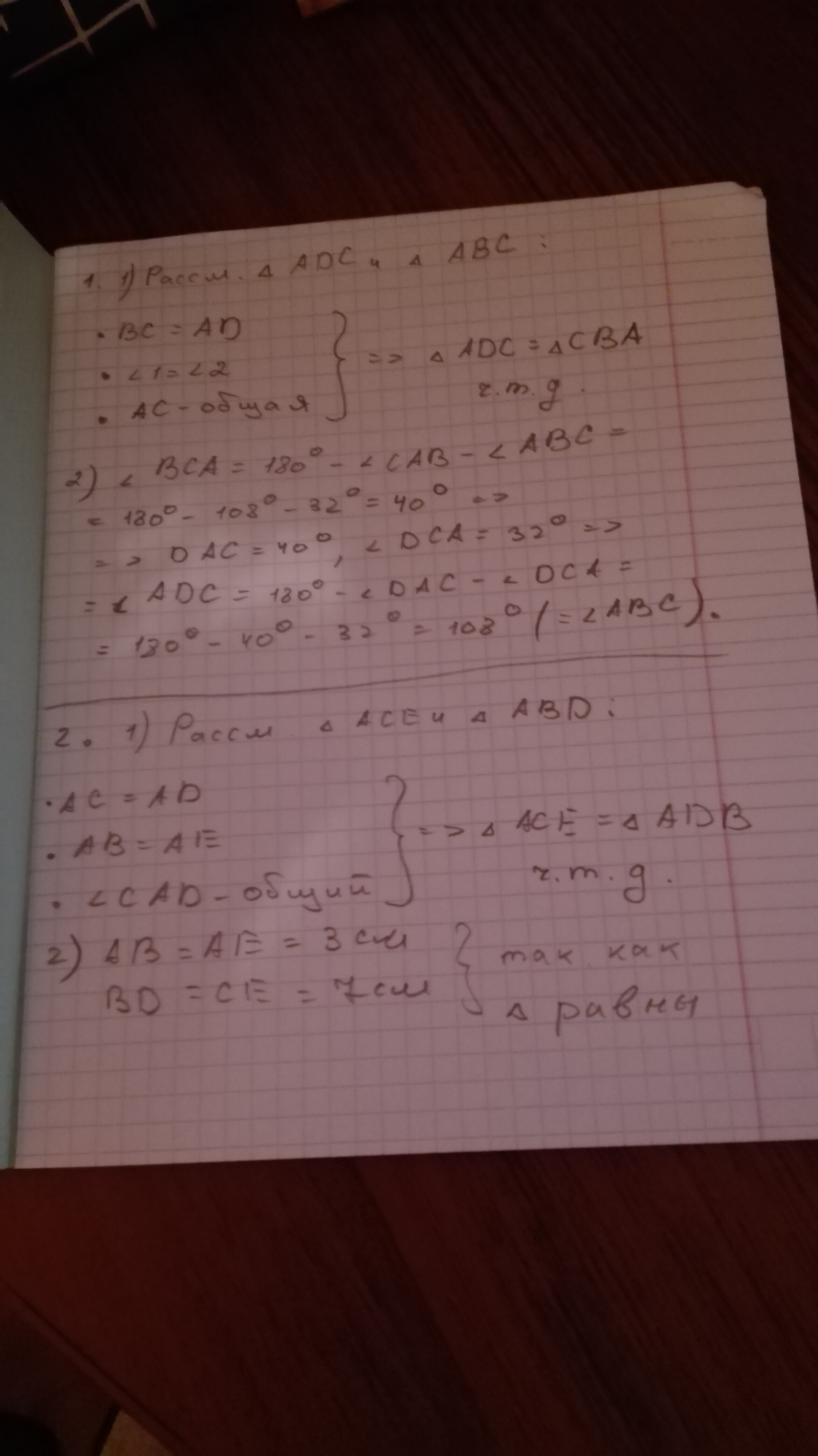 1) Т.к. BC=AD, угол 1 = углу 2 и AC - общая,