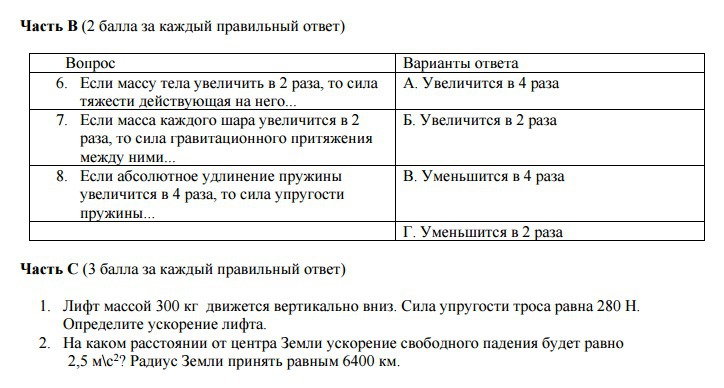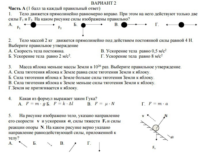 1.В., 2. Б.,так как F=ma. 4=2a a= 2., 3.Б ( ну естественно не яблоко тянет землю))., 4.Б., k - коэффицент упругости умножается на изменение длинны. 5.не уверенна но возможно А. Часть В: 6.Б., 7.Г., 8.А.