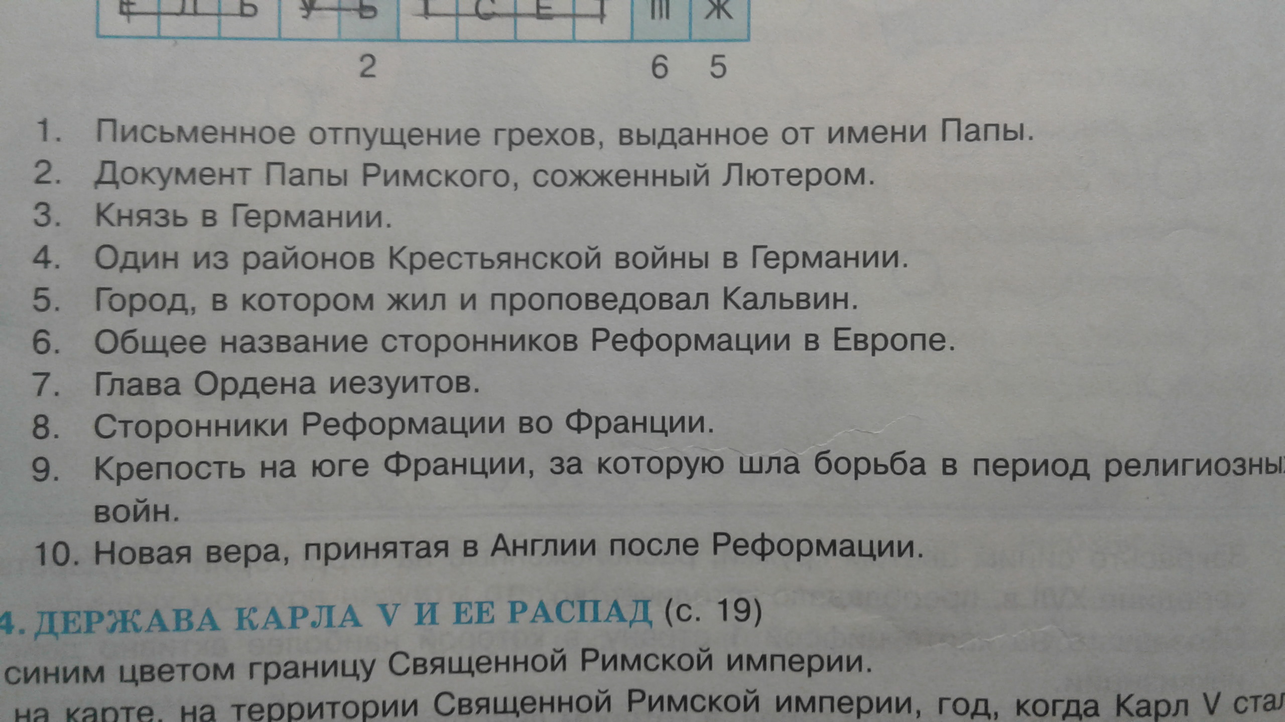 1 индульгенция, 2 Булла, 3 ландграф, 4 их было несколько 5 Женева, 6 протестанты, 7 Игнатий Лойола, 8 гугеноты, 9 Ля-Рошель, 10 англиканство