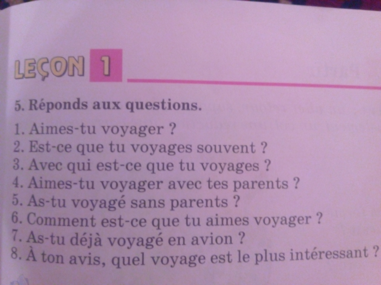 1)Вы любите путешествовать?---Oui, j'aime voyager(Да, я люблю путешествовать 2)Как часто вы путешествуете?---Je voyage rarement(Я редко путешествую) 3)C кем вы путешествуете---Je voyage avec les parents (Я путешествую с родителями) 4)Вы любите путешествовать с родителями?---Oui, j'adore voyager avec eux (Да, я люблю с ними путешествовать) 5)Вы путешествовали без родителей?---Non, je ne voyage pas sans leurs parents(Нет, я не путешествовала без родителей) Извини, дальше не смогу, очень трудное задание, я с помощью переводчика перевела)))