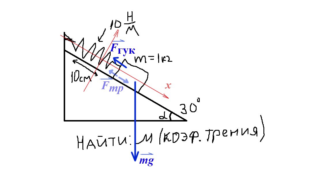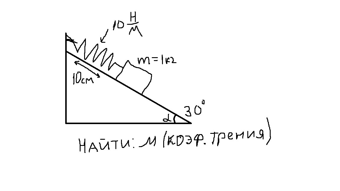 К пружине подвесили груз массой 1кг и она растянулась на 10см(дельта x). Найдите коэффициент трения. Упругость пружины 10Н/м, а угол альфа=30 градусам. (Если не понятно, то я прикрепил файл paint с рисунком задачи).