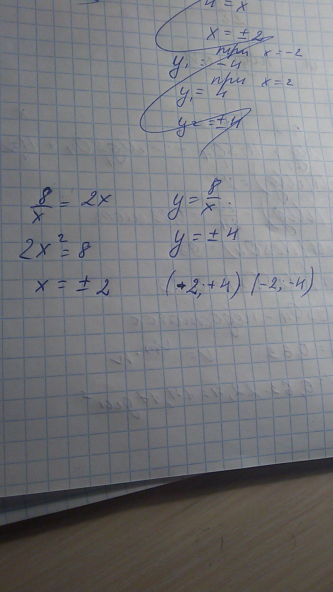 Не выполняя построения графиков функций y=8/x и y=2x найдите координаты точек их пересечения.