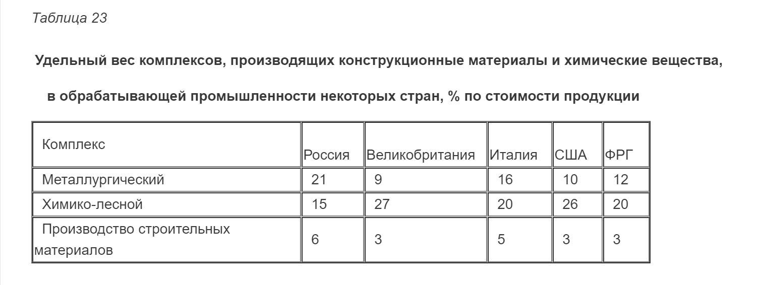 Таблица 23 «Удельный вес комплексов, производящих конструкционные материалы и химические вещества, в обрабатывающей промышленности некоторых стран, % по стоимости продукции».