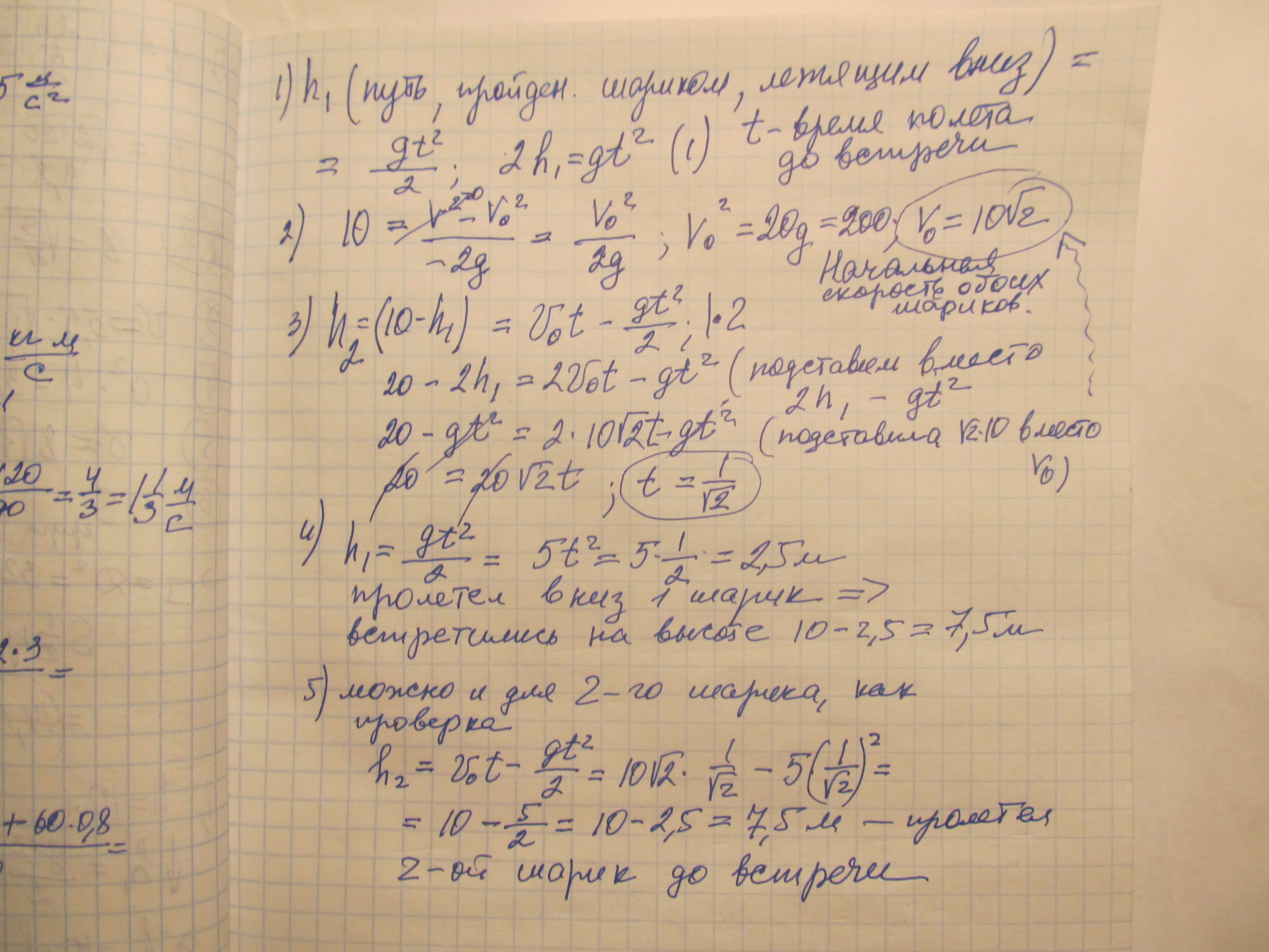 1014. Из одного положения вертикально вверх брошены друг за другом с одинаковой начальной скоростью два шарика. Второй шарик брошен в момент достижения первым максимальной высоты, равной 10 м.На какой высоте они встретятся?