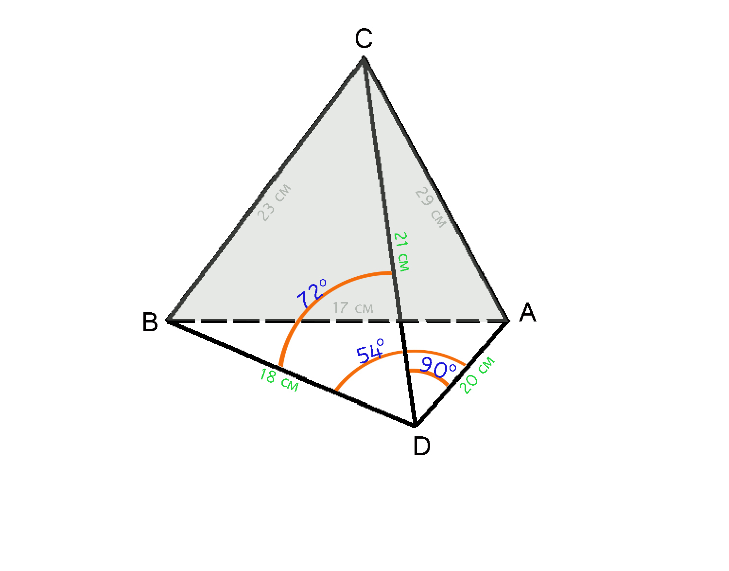 (Площадь грани ABC, которая по условию задачи является основанием тетраэдра, вычисляется всё по той же формуле Герона: квадратный корень из произведения полупериметра треугольника и разностей полупериметра с каждой из сторон. p = (23+17+29) : 2= 34,5 S=√ (34,5 × (34,5-17)×(34,5-23)×(34,5-29))= √38187,1875=195,4 см²)