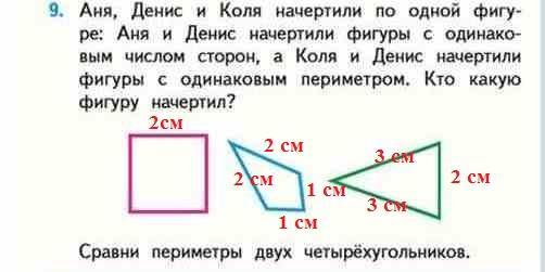 Реши задачу:Аня Денис и Коля начертили по одной фигуре:Аня и Денис начертили фигуры с одинаковым числом сторон,а Коля и Денис начертили фигуры с одинаковым периметром.Кто какую фигуру начертил?