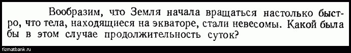 2) Условие невесомости на экваторе: g=V^2/R V=sqrt(g*R) R=6378 км