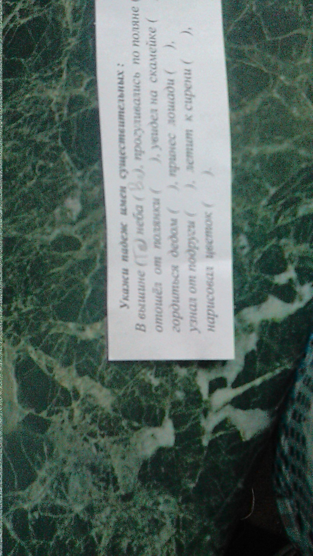 В вышине - предложный, неба - родительный, по поляне - дательный, от полянки - родительный, на скамейке - предложный, дедом - творительный, лошади - дательный, от подруги - родительный, к сирени - дательный, цветок - винительный