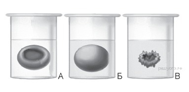 В стеклянные стаканы, заполненные растворами поваренной соли различной концентрации, поместили эритроциты. Рассмотрите рисунки и определите по внешнему виду эритроцита концентрацию раствора в сосуде А, если в крови в норме она составляет 0,9%.