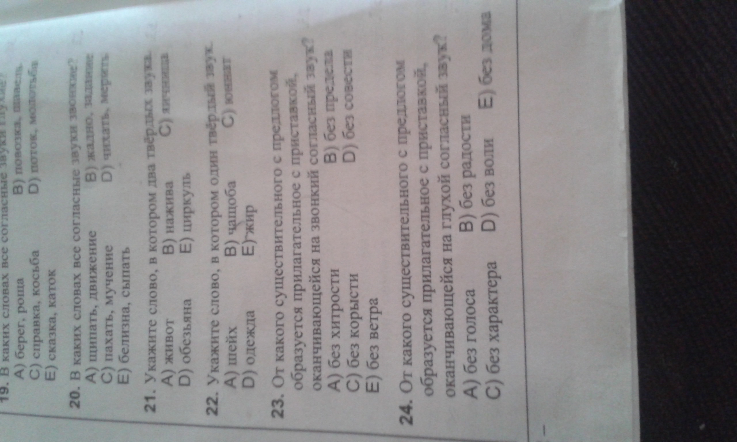 19) Е ([скаска, каток]). 20) В ([жадна, задан'ийэ]). 21) С ([йаиШн'иЦа]) 22) В ([чищоБа]) 23) Е (беЗветренный) 24) С (беСхарактерный)