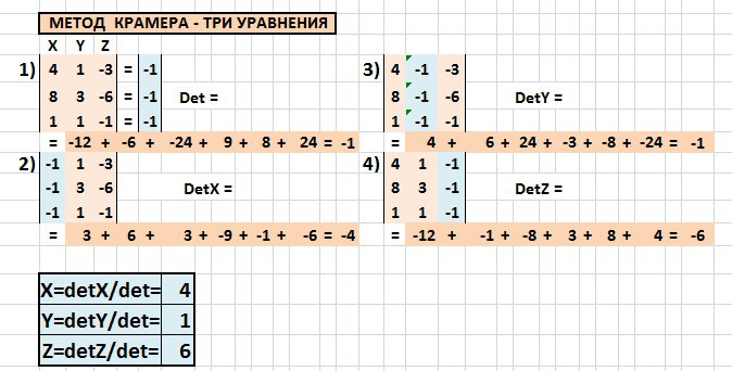 Формулы Крамера - вычисление четырех определителей.
