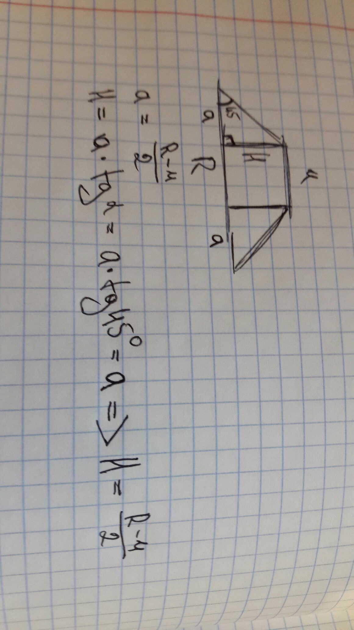 Радиусы оснований усеченного конуса R и r образующая наклонена к основанию по углом в 45 градусов.Найти высоту.