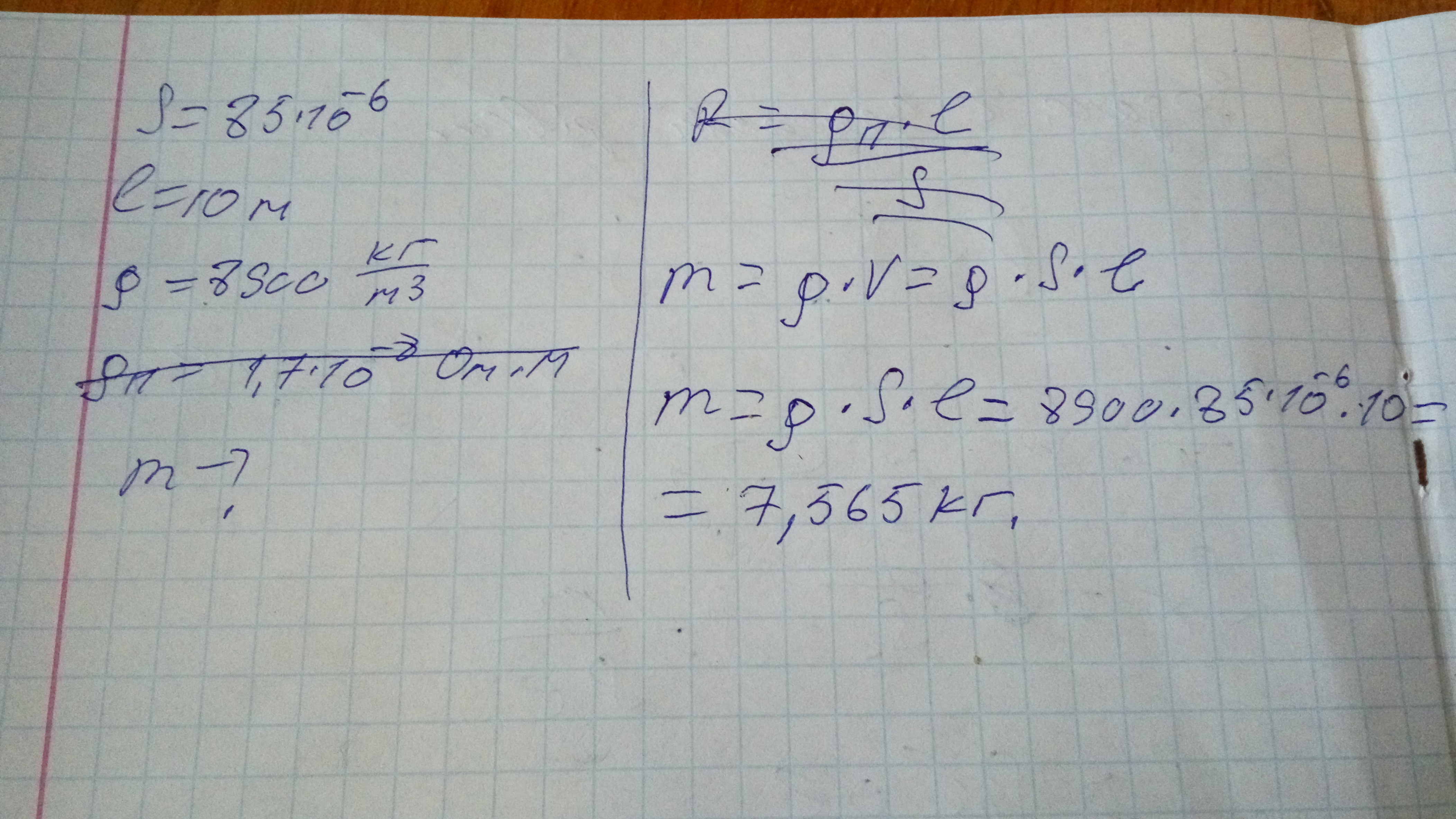 m=(ро)*V=(ро)*S*L=8900кг/м^3*10м*85*10^(-6)м^2=8,9*8,5*10^5*10^(-6)=