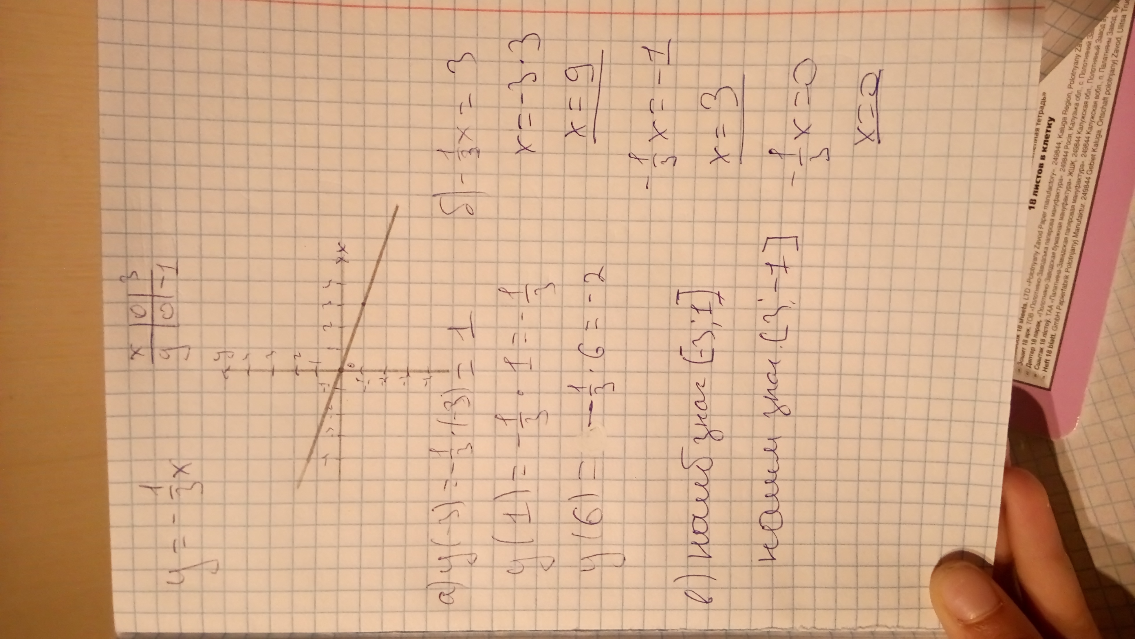 Срочно! Постройте график линейной функции y=-1/3x. Найдите по графику : а) значение функции при x =-3,1,6. б) значение аргумента при y=3,-1,0. в) наибольшее и наименьшее значение функции на отрезке [-3,3]