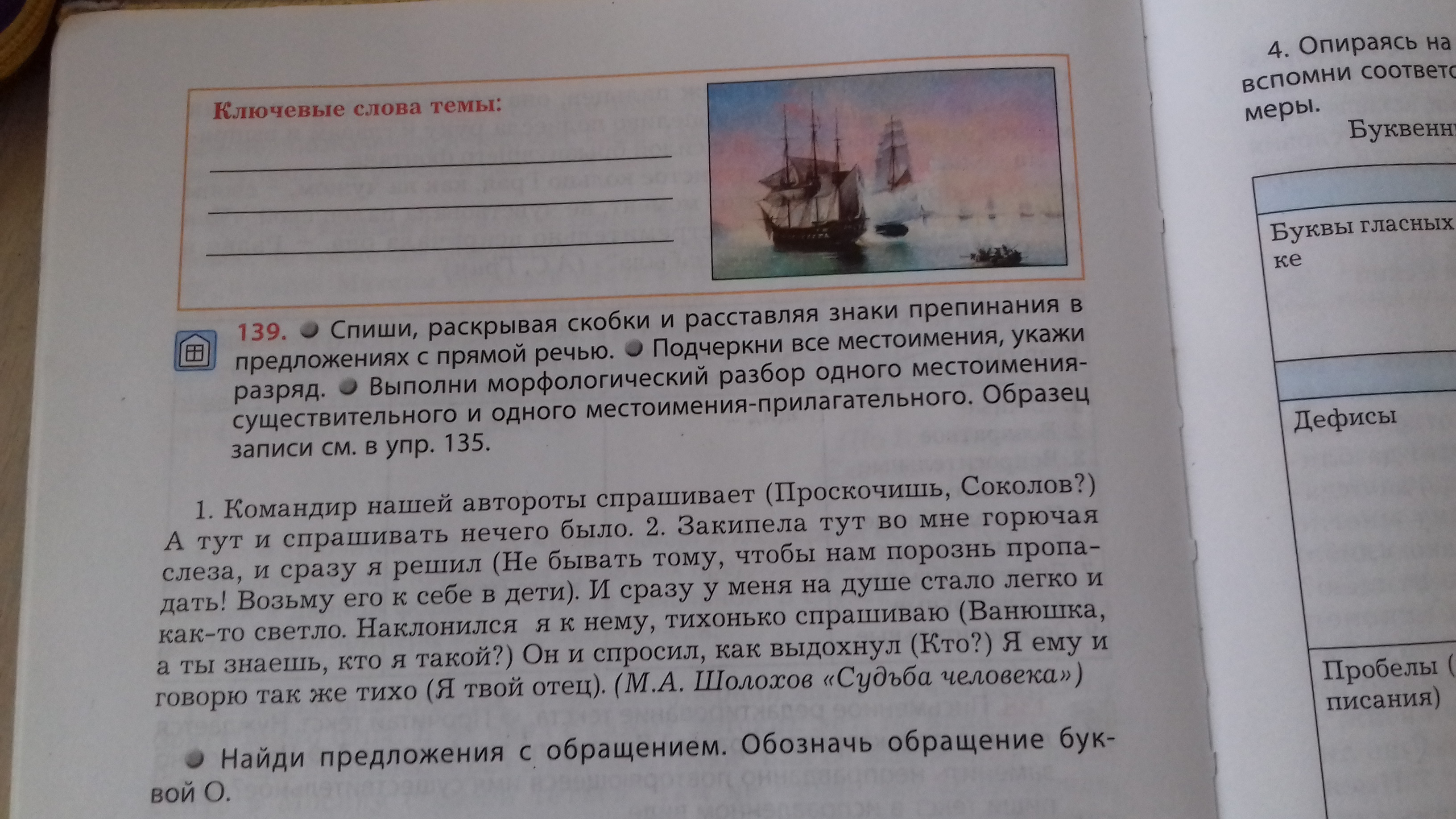 2. Закипела тут(указательное) во мне(личное) горючая слеза, и сразу я(личное) решил: "Не бывать тому, чтобы нам(личное) порознь пропадать! Возьму его(личное) к себе в дети". И сразу у меня(личное) на душе стало легко и как-то(неопределённое) светло. Наклонился я(личное) к нему(личное), тихонько спрашиваю: "Ванюшка, а ты(личное) знаешь, кто(личное) я(личное) такой?" Он(личное) и спросил, как выдохнул: "Кто(личное)?" Я(личное) ему(личное) и говорю так же(указательное с частицей "же") тихо: "Я(личное) - твой(притяжательное) отец".