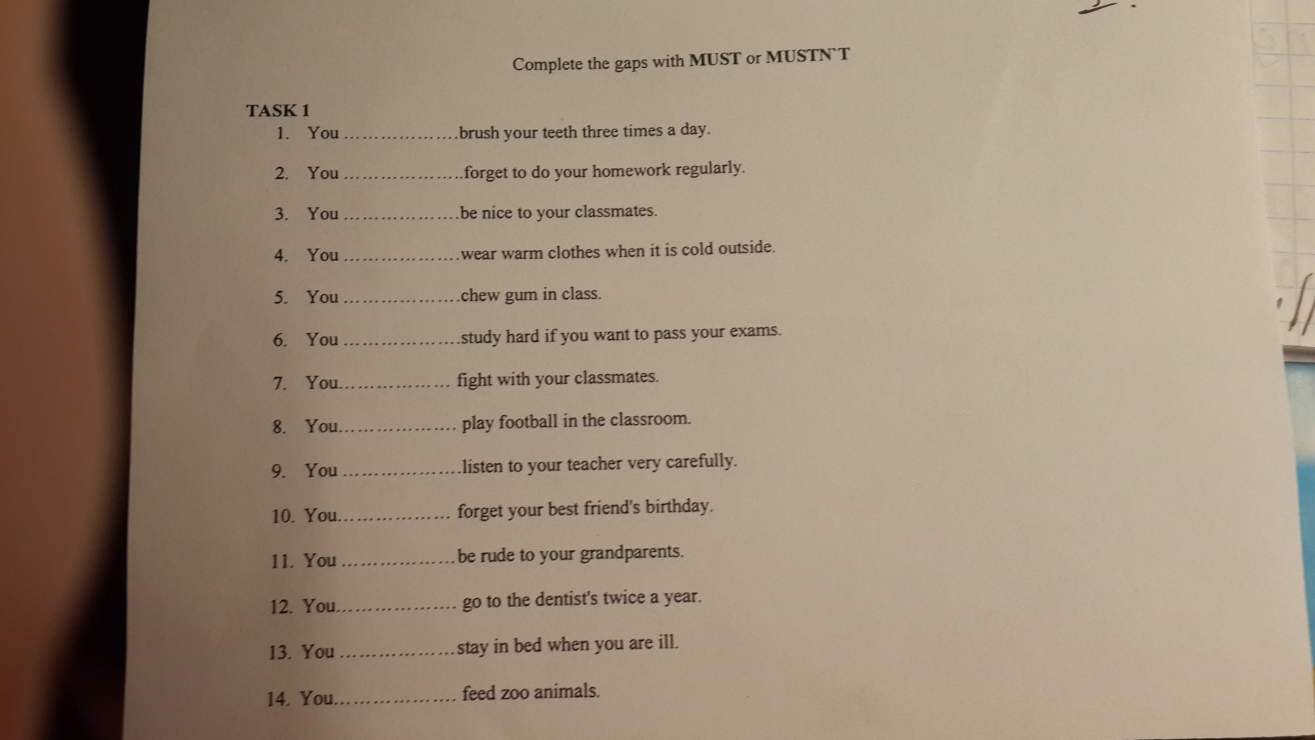 Решите пожалуйста этот листочек весь. Вы должны будете вместо пропушенных строчек вставить либо Must или Mustn't. Заранее СПАСИБО.