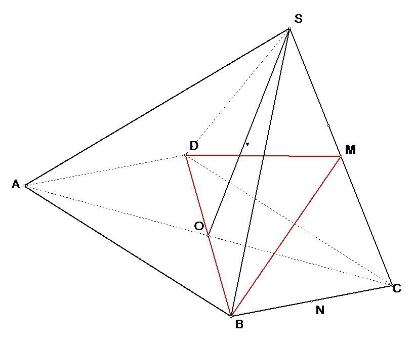 М - середина ребра, значит DM и ВМ перпендикулярны SC, т.к. боковые грани - равносторонние треугольники.DM=BM=√3/2, DB=√2. Применим теорему косинусов для угла М. cos M = (DM²+BM²-DB²)/(2*DM*BM) =