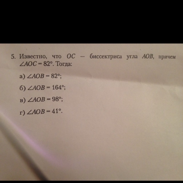 Поскольку биссектриса делит угол пополам, значит АОС=СОВ, т.к. ОС—биссектриса, из этого следует, что АОВ-164 градуса.