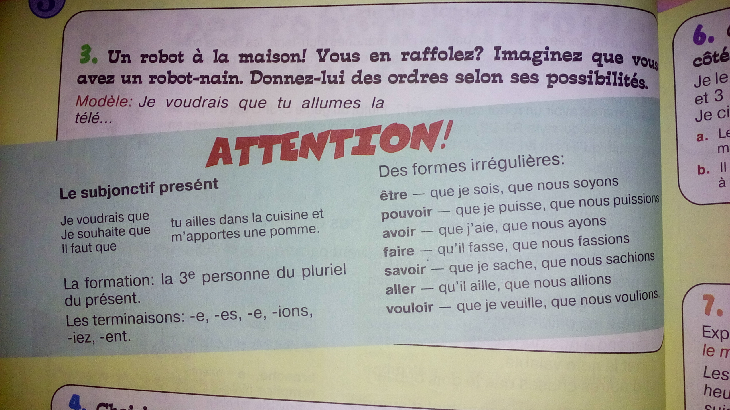 5) Il faut que tu ailles dans le salon et allumes la télé. (Нужно, чтобы ты пошел в гостиную и включил телевизор.)