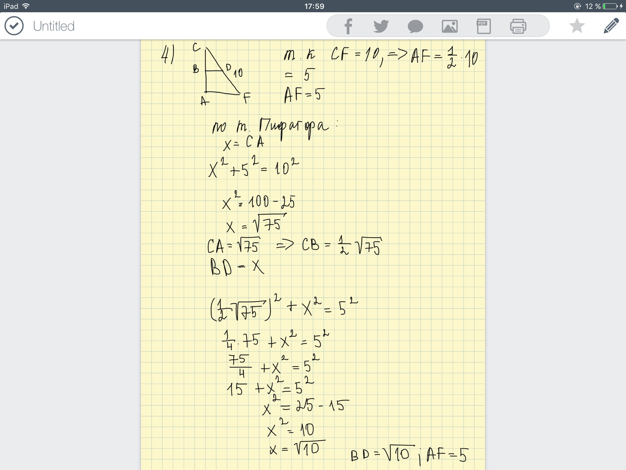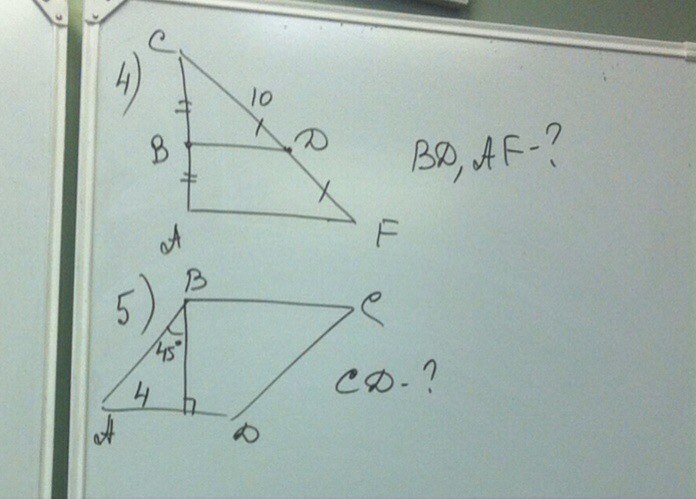 4) это египетский треугольник: сбд= один катет 6, другой 8, можешь проверить, поставив их во вторую степень и сложишь, получишь сто, корень -10- гипотенуза
