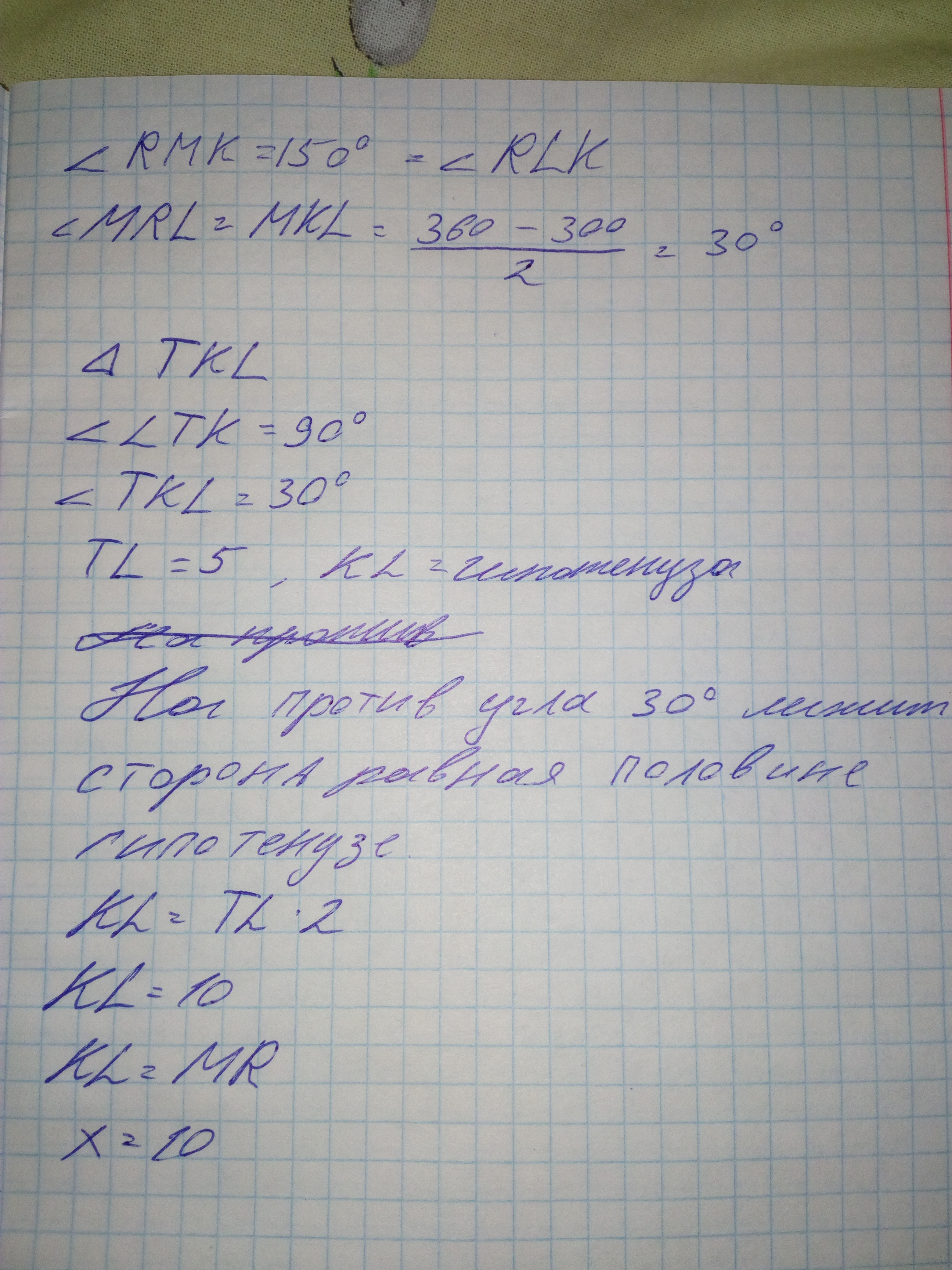 Угол М равен 150 , угол R равен 180-150=30.