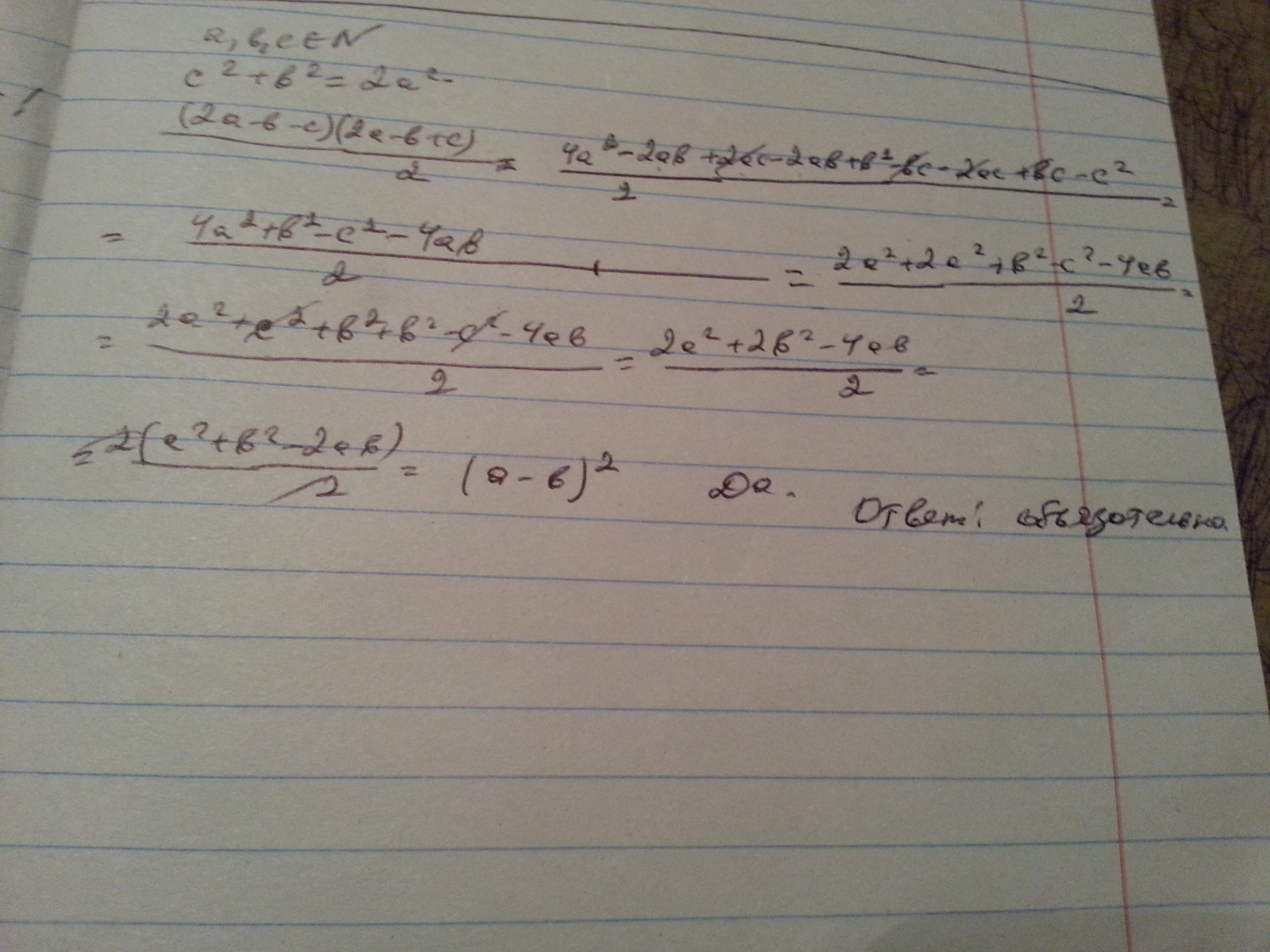 Натуральные числа a, b, c таковы, что с^2 + b^2 = 2a^2. Обязательно ли, что является точным квадратом число ((2a - b-c) * (2a - b + c)) / 2