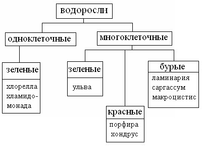 Водоросли делятся на 3 отдела: Зелёные, Бурые и Красные водоросли. Зеленые, в свою очередь, есть многоклеточные(Улотрикс, Спирогира, Ульва, Нителла) и одноклеточные(Хламидомонада, хлорелла, плеврококк). Бурые →Ламинария, фукус, цистозейра, саргассум. Красные →Порфира, Анфельция, родимения, филлофора.