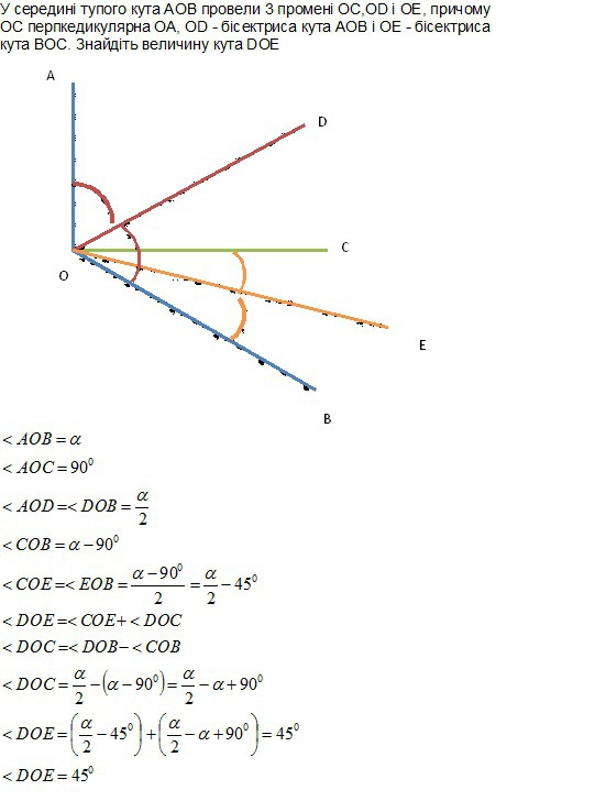 У середині тупого кута АОВ провели 3 промені OC,OD i OE, причому OC перпкедикулярна OA, OD - бісектриса кута AOB i OE - бісектриса кута BOC. Знайдіть величину кута DOE