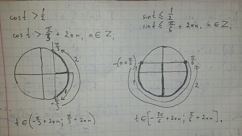 a);cost  textgreater   frac{1}{2}\t in (-frac{pi}{3}+2pi n; frac{pi}{3}+2pi n), ; nin Z;\ \b); sint leq frac{1}{2}\tin [-frac{7pi}{6}+2pi n;frac{pi}{6}+2pi n], ; nin Z.