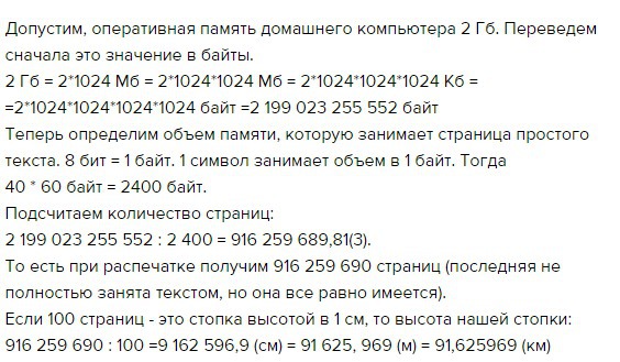 Уточните, какой объём оперативной памяти компьютера, к которому вы имеете доступ дома или в школе. Сколько страниц текста можно разместить в памяти этого компьютера ( на странице размещается 40 строк по 60 символов в каждой строке, а для хранения одного символа требуется 8 битов? Объём оперативной памяти 4 ГБ
