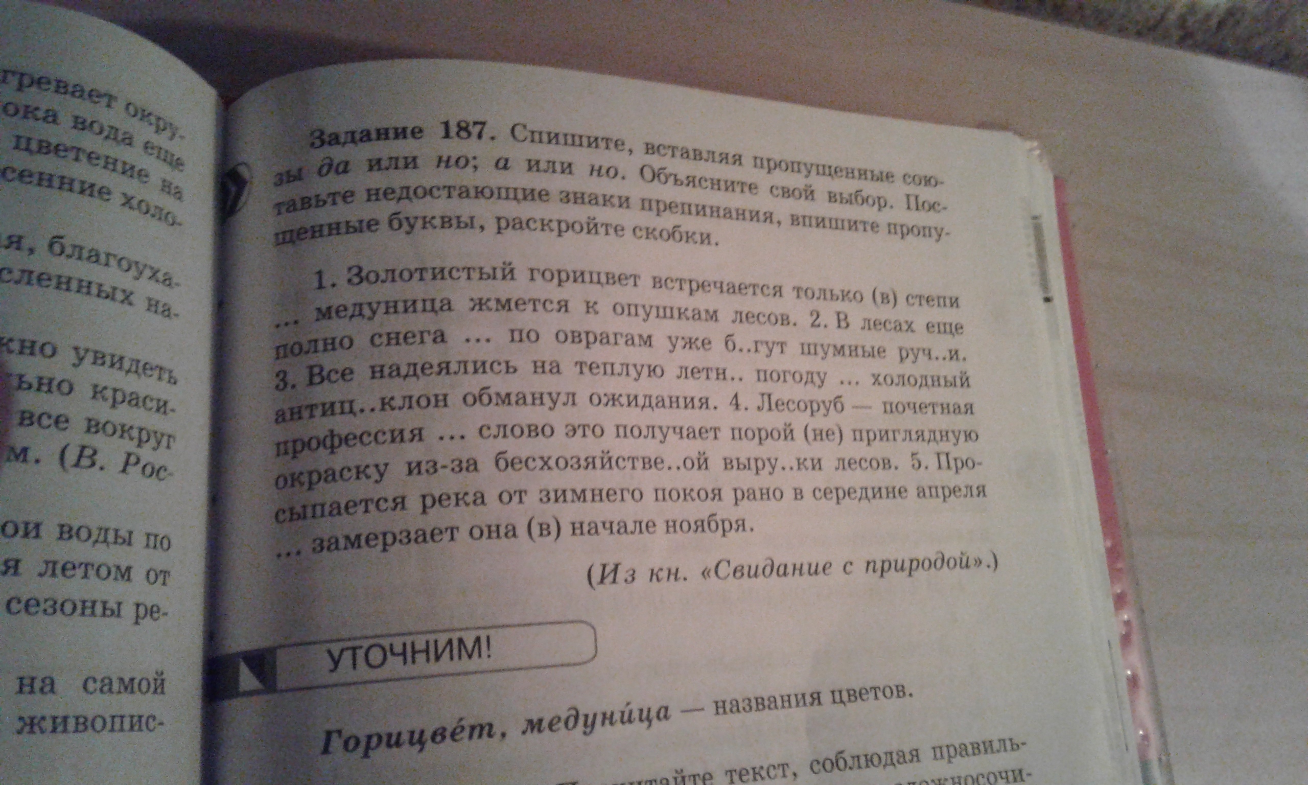 Золотистый горицвет встречается только в степи, а медуница жмётся к опушкам лесов. В лесах еще полно снега, но по оврагам уже бегут шумные ручьи. Все надеялись на тёплую летнюю погоду, но холодный антициклон обманул все ожидания. Лесоруб - почетная профессия , но слово это порой получает неприглядную окраску из-за бесхозяйственной вырубки лесов. Просыпается река от зимнего покоя рано, в середине апреля, а замерзает она в начале ноября.